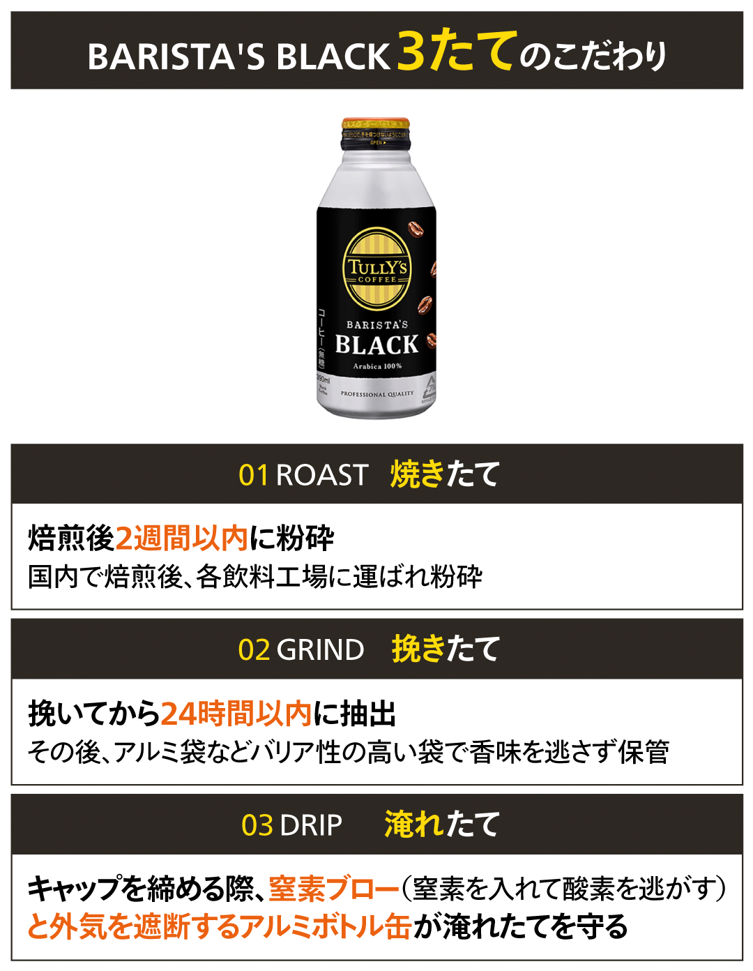 コーヒー豆には、タリーズのバリスタが監修した「アラビカ種」のみを100%使用。栽培に手間がかかる品種だが、風味豊かで高い評価を得ており、レギュラーコーヒーでも使用されている品種だ。製造工程では、ショップで楽しめるような香り高いコーヒーの味わいを目指し、「焼きたて、挽きたて、淹れたて」を貫いている。